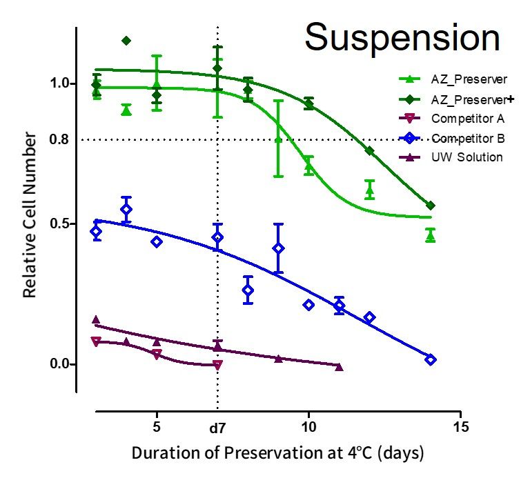 Human adipose-derived MSCs were seeded onto culture plates and preserved at 4 °C using various preservation solutions at approximately 50% confluency. As a result, **AZ PRESERVER/+** maintained cell viability over a longer period compared to commercially available preservation solutions (Solution A and Solution B) and UW solution (left figure). Furthermore, even when preserved as a single-cell suspension, high viability was confirmed after re-seeding (right figure).