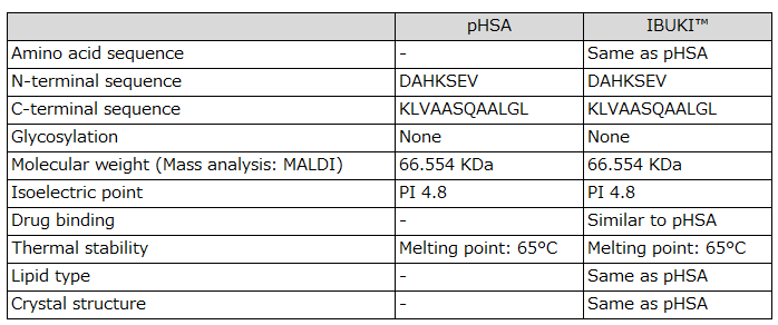 - IBUKI is expressed as HSA full-length protein and shows the same molecular weight and isoelectric point (pI) as the natural form. There is no glycosylation.