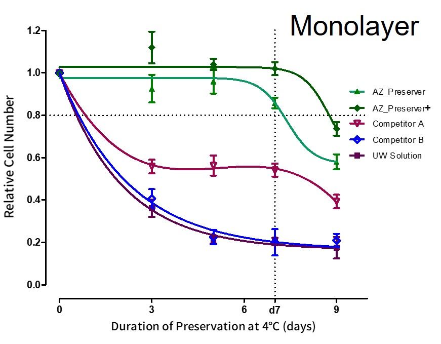 ヒトiPS細胞由来心筋細胞を4日間培養後、各種保存液で4 ℃保存した。市販保存液(A液, B液) およびUW液では3日目以降に生存性が低下したのに対し、**AZ PRESERVER+**では8日以上の保存が可能であった。再培養後も心筋細胞の拍動は正常に維持された。